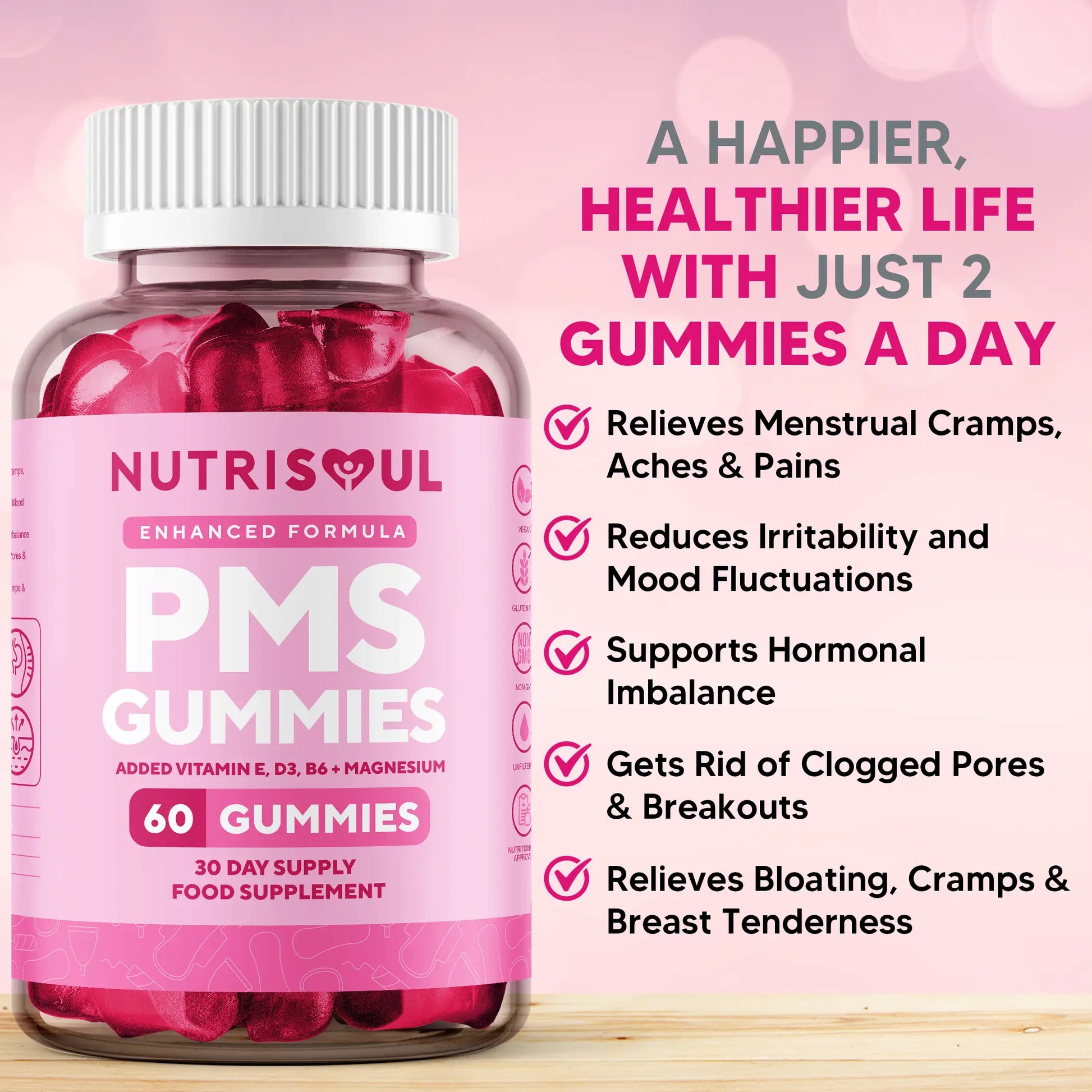 Our PMS Gummies are formulated with ingredients like chasteberry and vitamin B6, which may help alleviate common PMS symptoms such as mood swings, bloating, and discomfort.